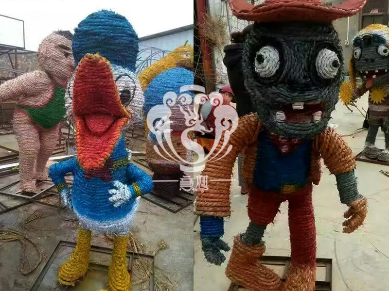 稻草人藝術,不僅充分利用的稻草秸稈制作出各種有趣的形象,與此同時還能減少秸稈的焚燒,為我們的藍天白云,子孫后代做一份貢獻!現在的精致稻草人藝術通常是由專業美術老師的造型放樣,然后由焊工師傅焊接出立體造型造型,然后以稻草或者稻草繩為材料編捆制作而成。